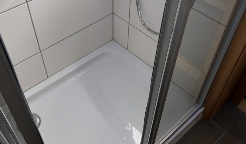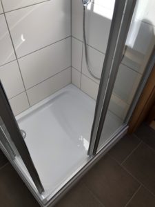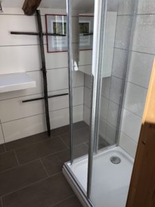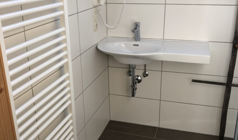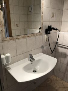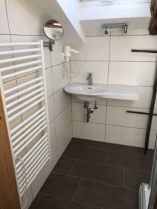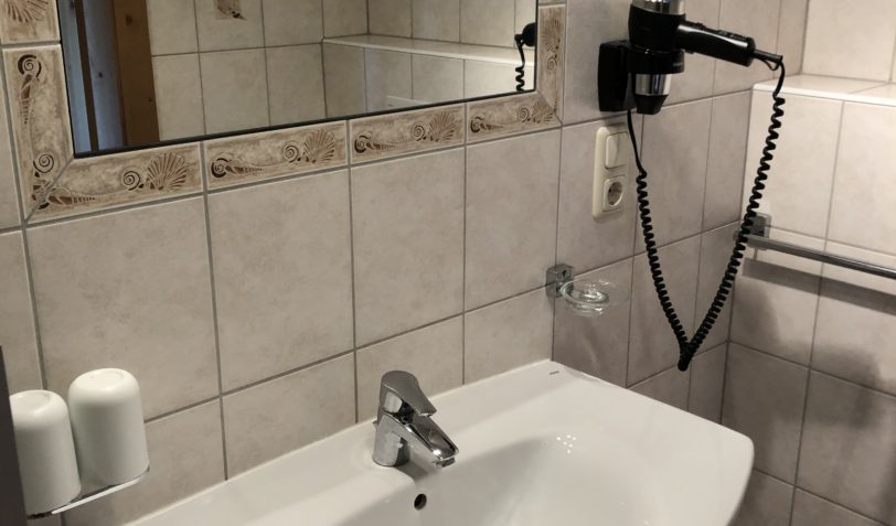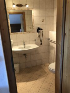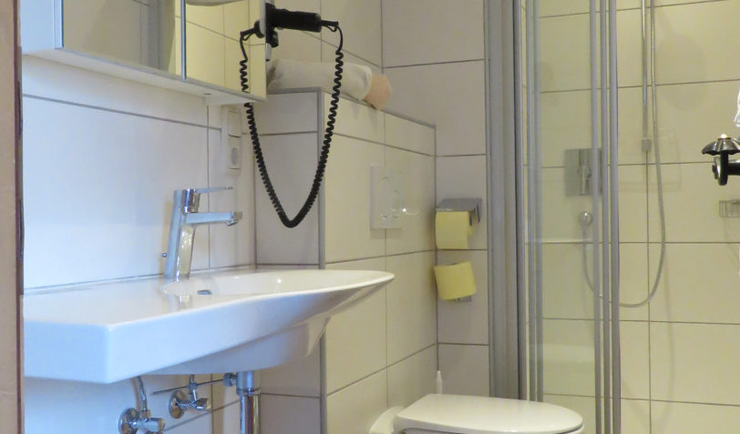 Badkamer met douche, toilet, wastafel, hotelföhn