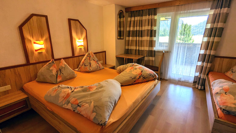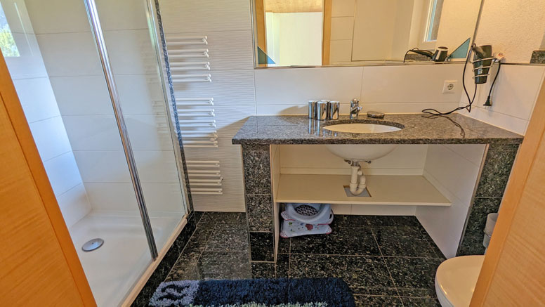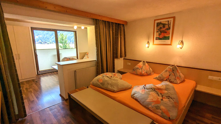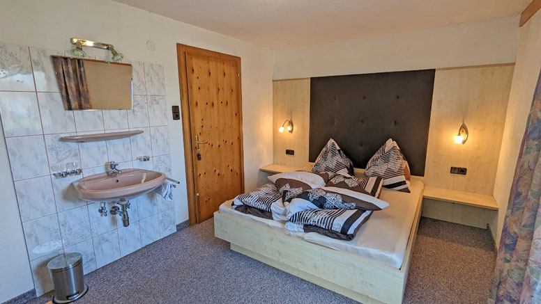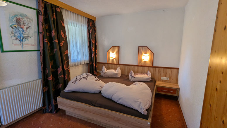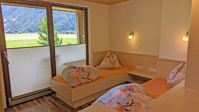 Een 2-persoonskamer (2-persoonsbed) met fl. water en balkon; een 3-persoonskamer (2-persoonsbed en 1-persoonsbed) met balkon met prachtig uitzicht; een 4-persoonskamer (gezinskamer met 2-persoonsbed en 2 1-persoonsbedden) met douche/WC met balkon met prachtig uitzicht op het achterste Ötztal; een badkamer met dubbele wastafel, douche en WC; aparte WC.
