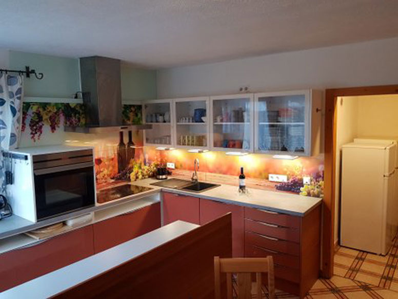 Gezellige eet- en recreatieruimte met Smart-TV en betegeld fornuis; direct aangrenzende mooie wintertuin met verdere zit-/eettafels; goed uitgeruste keuken (inclusief keramische kookplaat, oven, vaatwasser, koffiezetapparaat, raclette/fondue) met zithoek; WC; zonneterras met barbecue.
